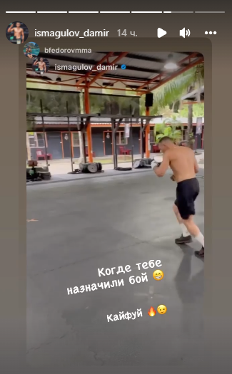 Вчера спортсмен опубликовал пост, где на видео тренируется под музыку, словно танцуя, и сообщил, что готовится к бою: "Когда внутри тебя играет музыка, тебя становится сложно остановить. Начинаем подготовку к бою".