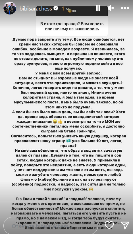 "Думаю, пора закрыть эту тему. Все люди ошибаются, нет среди нас таких, которые бы совсем не совершали ошибок, особенно в молодом возрасте. Я извинилась за то, что поддалась эмоциям и перешла на личности, этого не стоило делать, но мне, как публичному человеку, это сразу аукнулось, и свою огромную порцию хейта я все еще получаю", — ответила Бибисара.