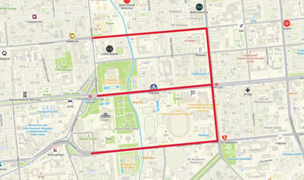 - Центральный стадион – «Алматы Арена» (маршрут А1, отправление по проспекту Абая, западное направление);