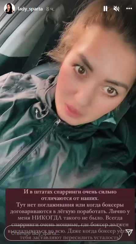"В Штатах спарринги очень сильно отличаются от наших. Тут нет поглаживания или когда боксеры договариваются влегкую поработать. Лично у меня никогда такого не было. Всегда спарринги мощные, где боксер должен выкладываться вовсю. Даже когда боксер устал, тебя заставляют пересилить усталость", — написала Аида в сторис.