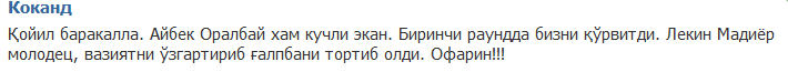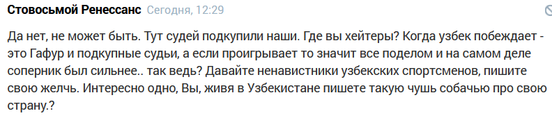 Мадияр вчера раздельным решением судей победил казахстанца Айбека Оралбая. Оба соперника успели побывать в нокдаунах. Большинство узбекских фанатов бокса похвалили спортсмена, но были и другие мнения.