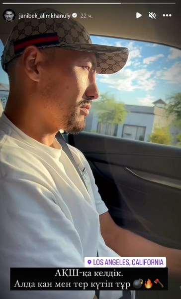 На своих аккаунтах в социальных сетях Алимханулы сделал два заявления: в «сторис» Инстаграма «Казахский стиль» написал: «АҚШ-қа келдік. Алда қан мен тер күтіп тұр» («Прибыли в США. Впереди ждут кровь и пот»), а в Твиттере спортсмен опубликовал видео прибытия в Штаты. .