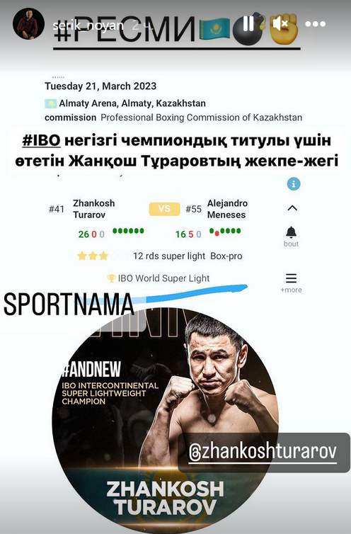 В его активе 26 побед на профи-ринге без поражений и ничьих, передает медиа-портал Сaravan.kz. Поединок состоится 21 марта в Алматы на "Алматы Арене". Соперником Турарова станет мексиканец Алехандро Менесес (16-5-0) по прозвищу "Бекон". Бой рассчитан на 12 раундов. Об этом сообщил менеджер Турарова.