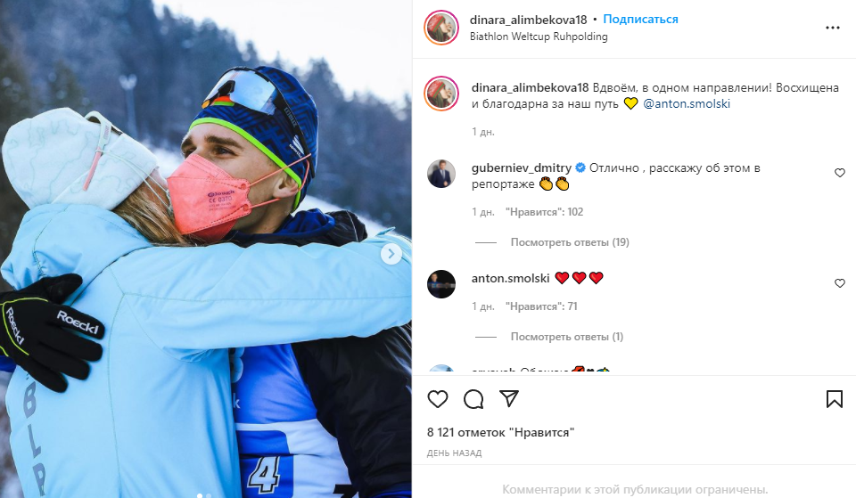 Напомним, Динара Алимбекова родилась в Карагандинской области, но ещё ребёнком переехала в Беларусь. Ещё осенью мы писали о том, что из-за отношений со Смольским спортсменку многие осуждают, поскольку Антон официально женат на другой биатлонистке.