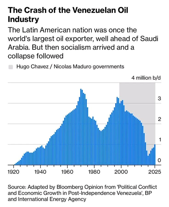 Диаграмма, опубликованная Bloomberg, охватывающая более ста лет (с 1920 до 2025 года), наглядно демонстрирует взлёт и затяжное падение венесуэльской нефтяной отрасли. В первой половине XX века Венесуэла уверенно наращивала добычу. Нефтяная отрасль развивалась, инфраструктура поддерживалась, в страну приходили технологии и инвестиции иностранных компаний. К 1960–1970-м годам добыча превышала 3,5 млн баррелей в сутки, и в этот период Венесуэла была одним из крупнейших экспортёров нефти в мире, опережая даже Саудовскую Аравию. Перелом наступил в конце 1970-х. После пиковых значений добыча начала постепенно снижаться. Тем не менее до 1990-х годов нефтяная промышленность ещё держалась, а добыча оставалась в диапазоне 2–3 млн баррелей в сутки. В конце 1990-х-начале 2000-х на графике заметен краткий откат вверх. Это совпало с ростом мировых цен на нефть и первыми годами правления Уго Чавеса.